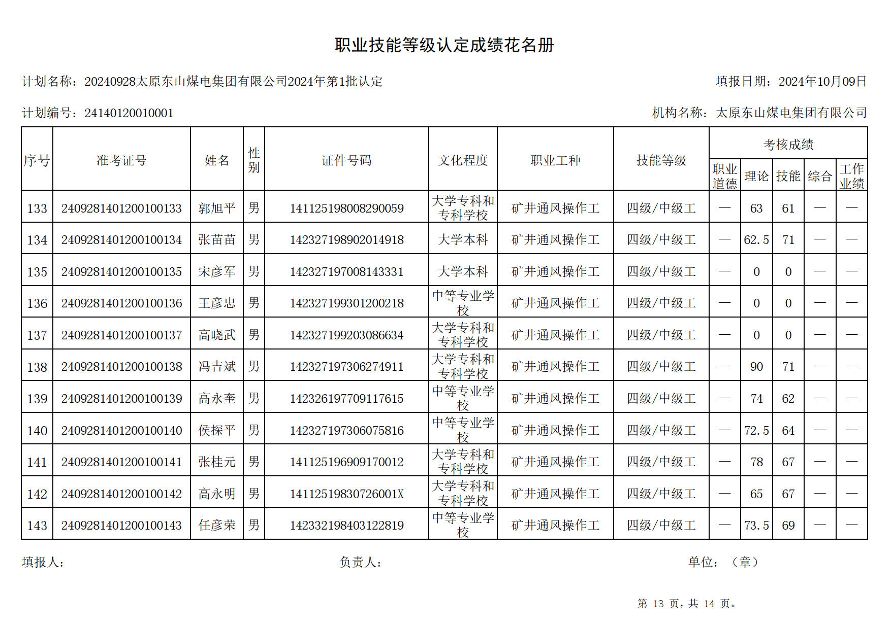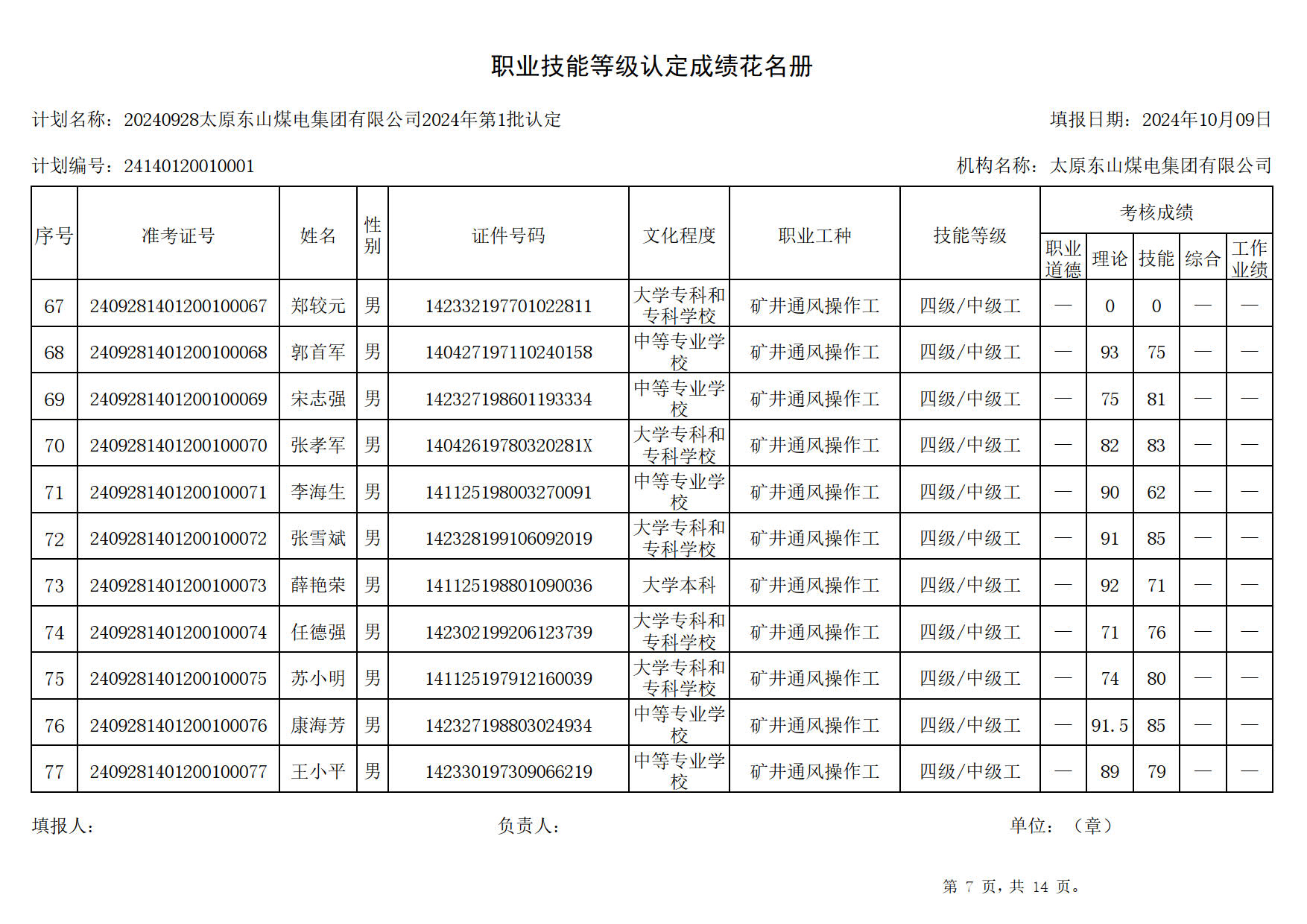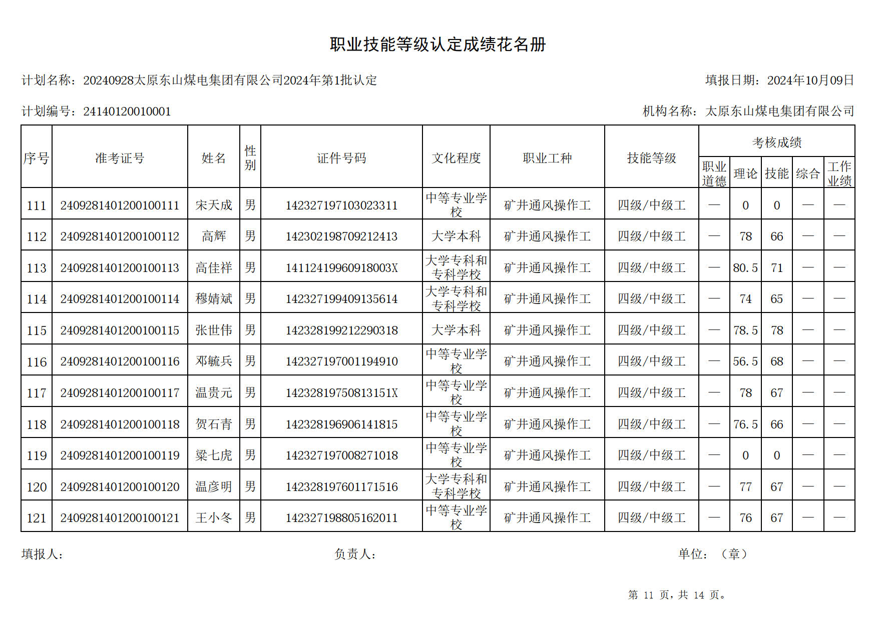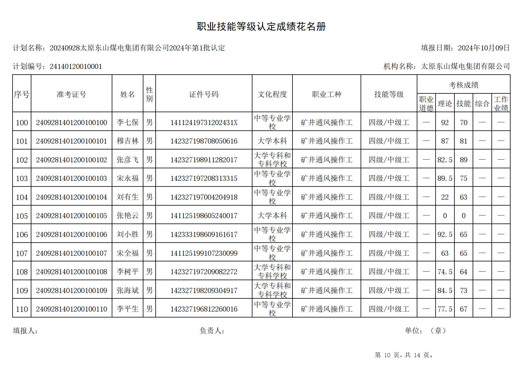 太原東山煤電集團有限公司于2024年9月28日、9月29日組織進行煤礦職業技能等級認定,現將第1批認定人員考試成績予以公示。對公示情況如有異議,請向太原東山煤電集團有限公司培訓中心反映。 公示時間:2024年10月10日-10月14日 監督電話:0351-4410454