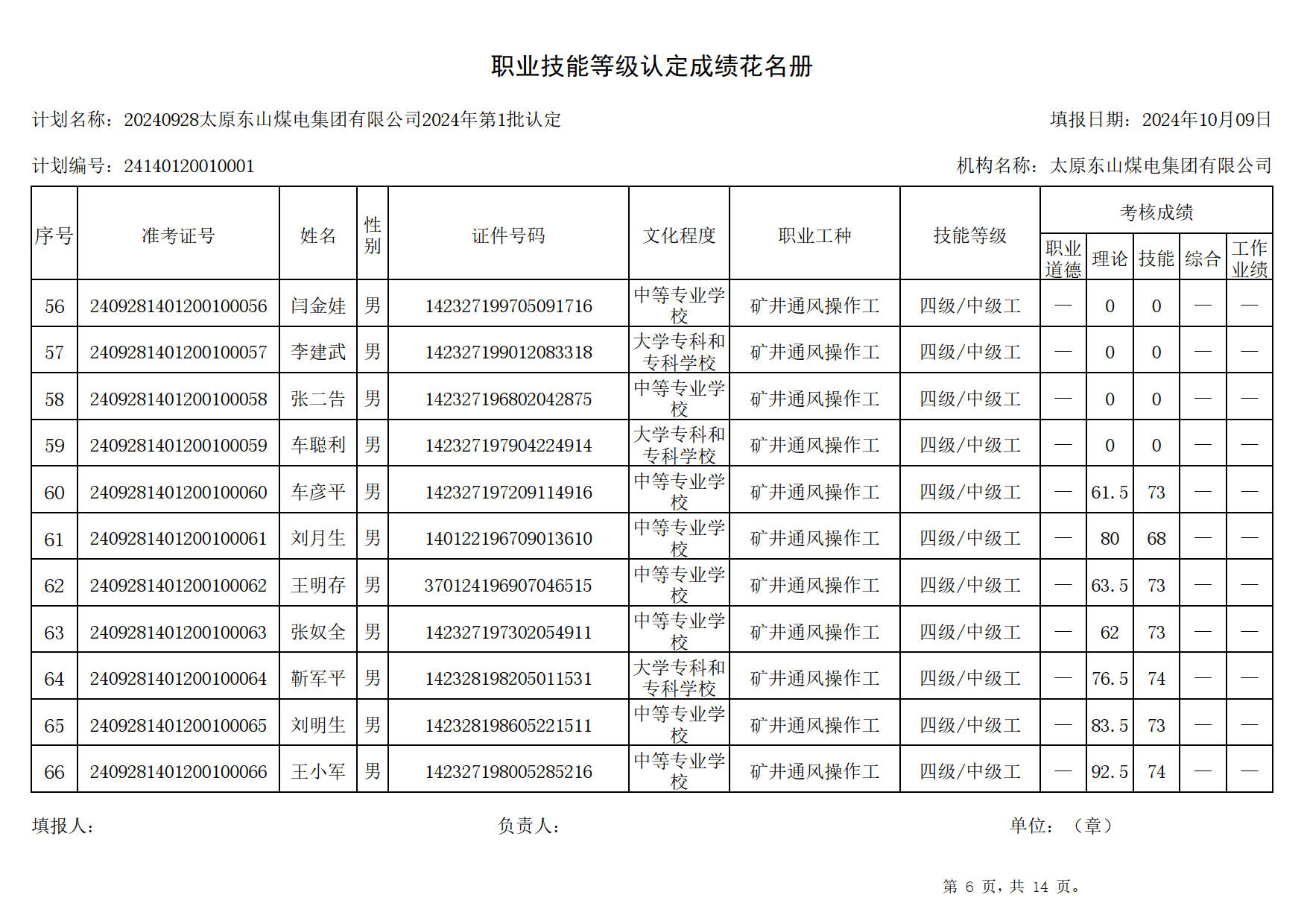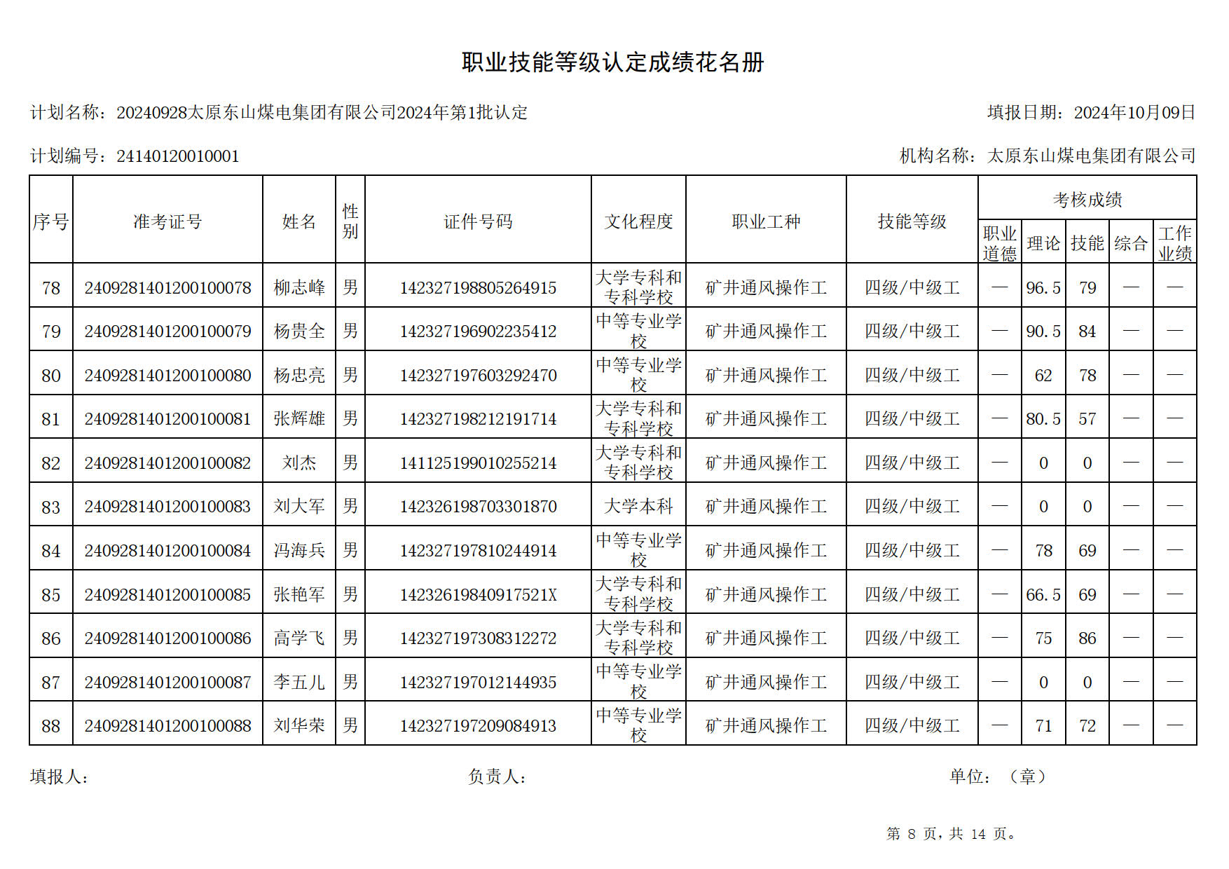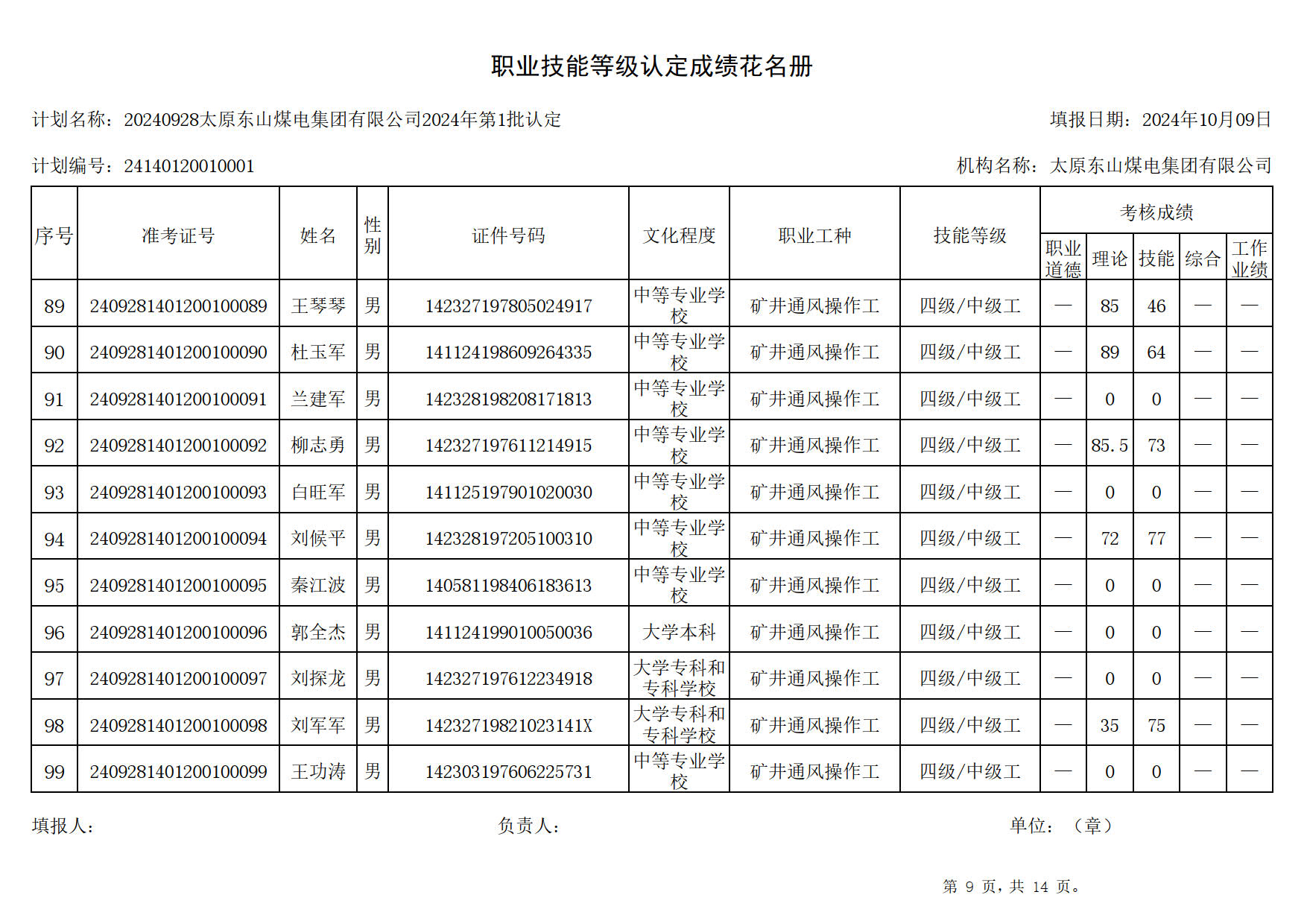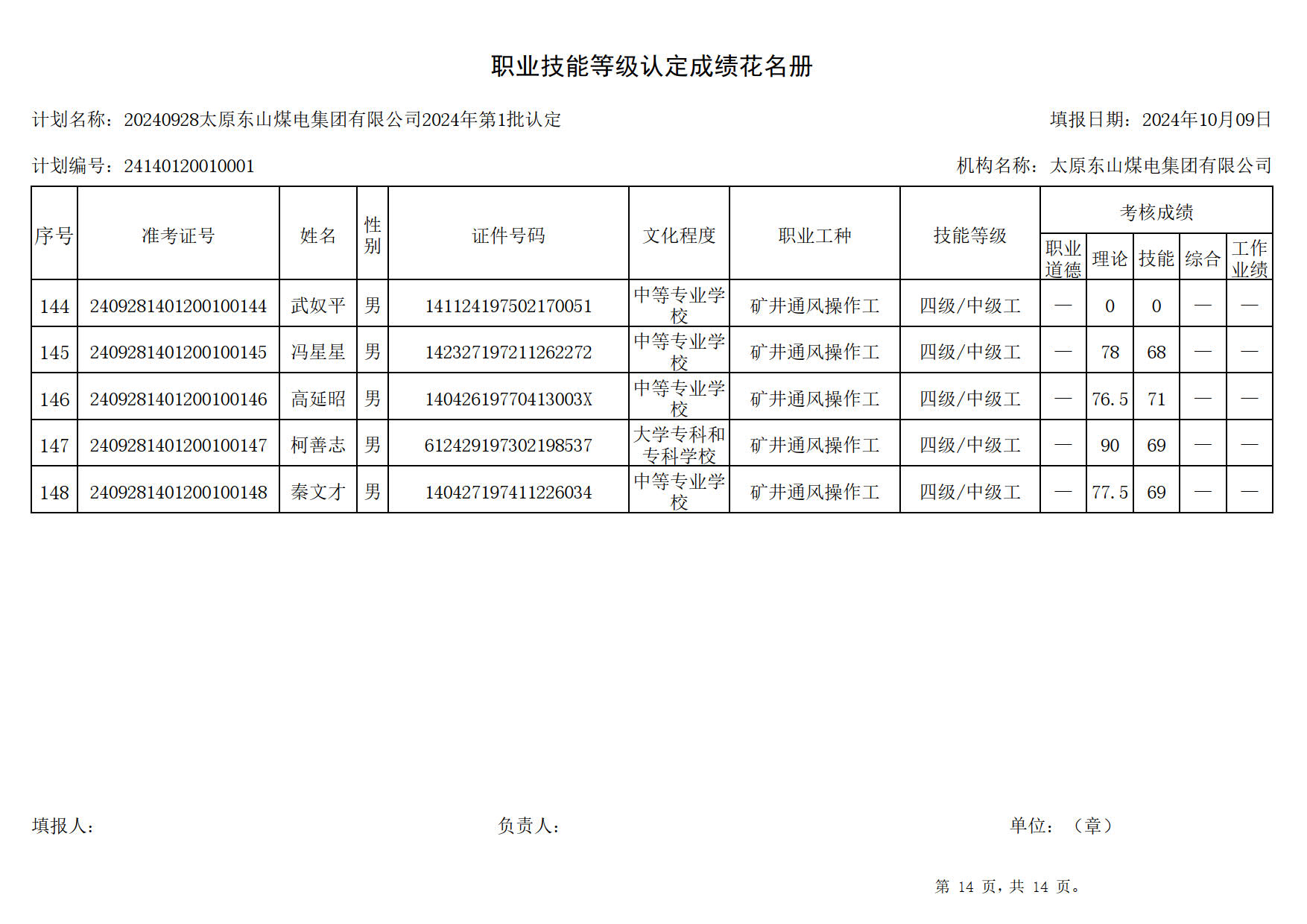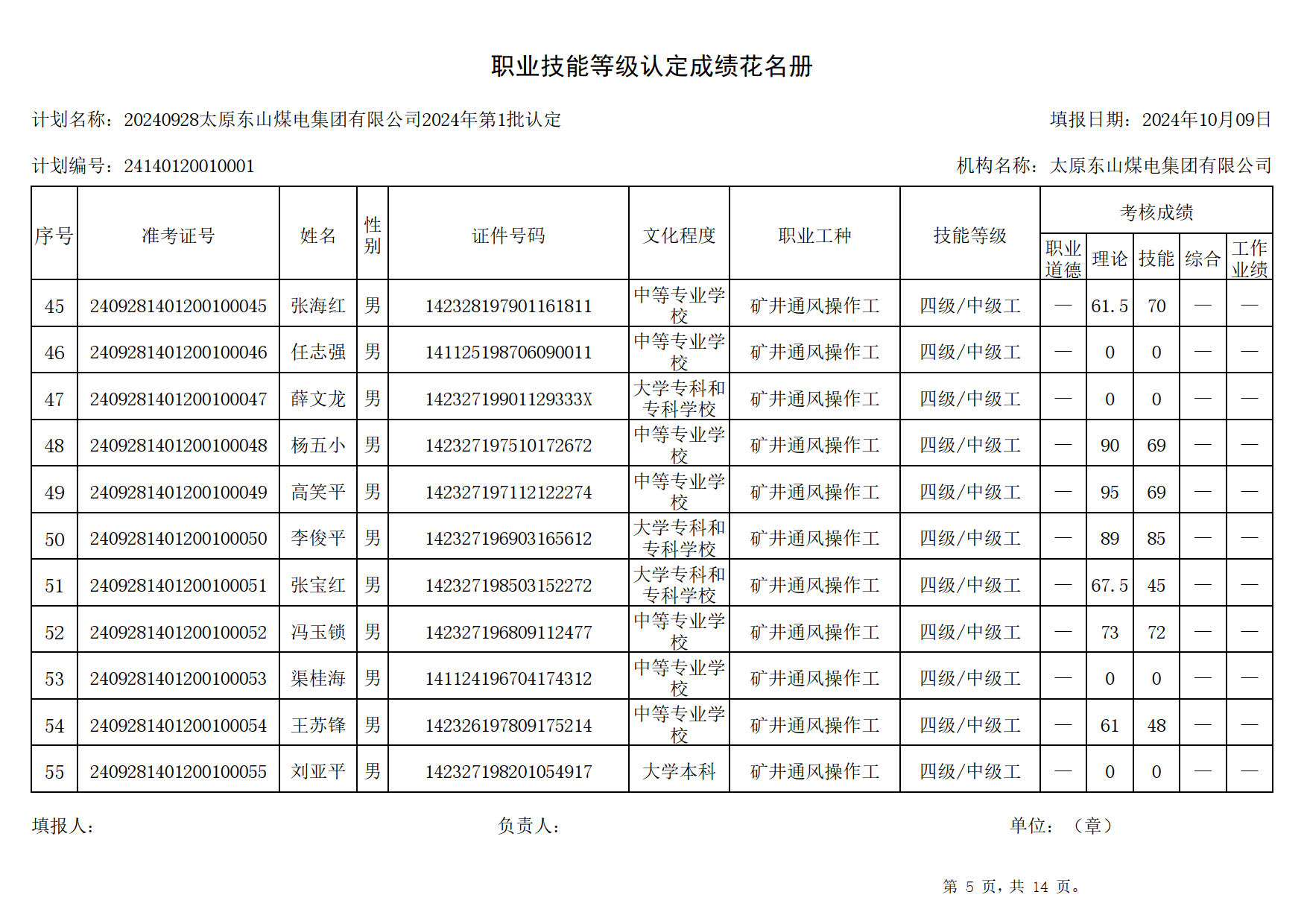 太原東山煤電集團有限公司于2024年9月28日、9月29日組織進行煤礦職業技能等級認定,現將第1批認定人員考試成績予以公示。對公示情況如有異議,請向太原東山煤電集團有限公司培訓中心反映。 公示時間:2024年10月10日-10月14日 監督電話:0351-4410454