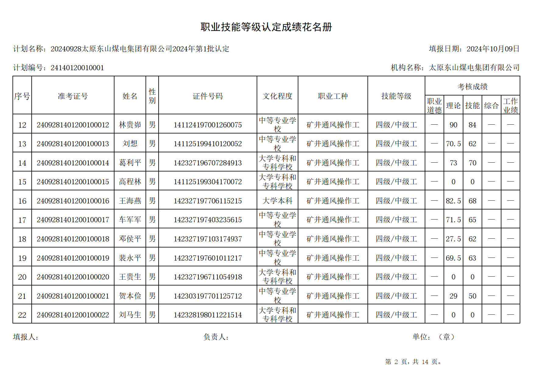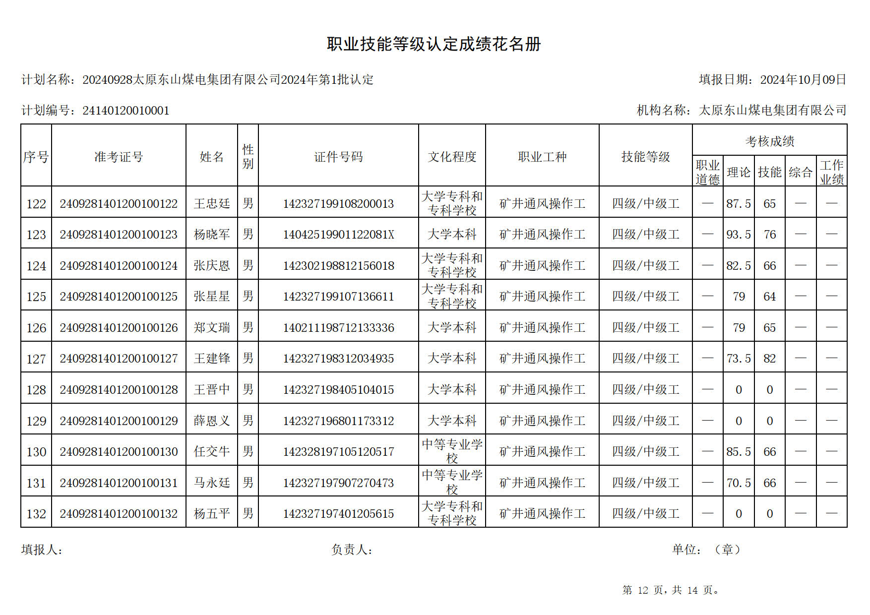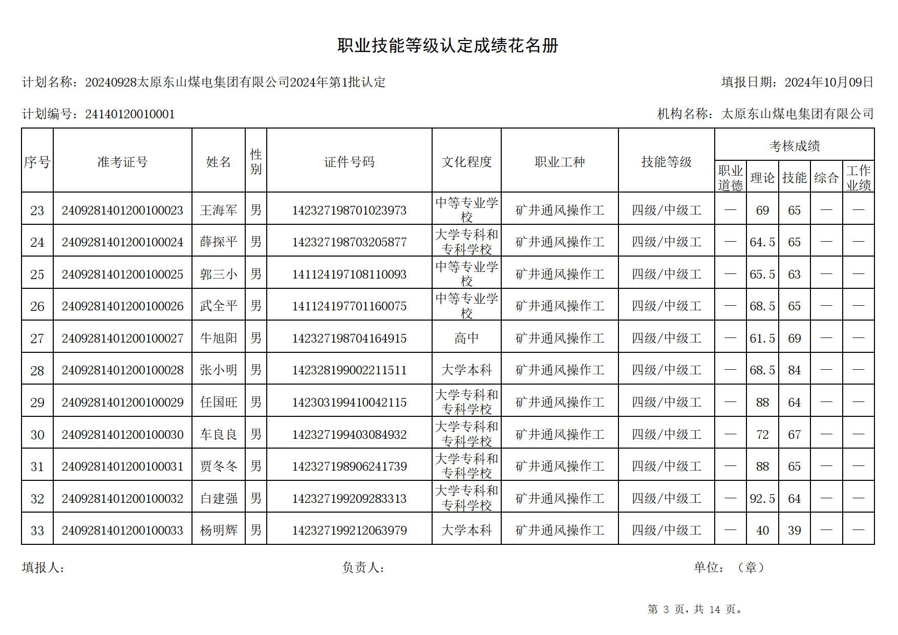 太原東山煤電集團有限公司于2024年9月28日、9月29日組織進行煤礦職業技能等級認定,現將第1批認定人員考試成績予以公示。對公示情況如有異議,請向太原東山煤電集團有限公司培訓中心反映。 公示時間:2024年10月10日-10月14日 監督電話:0351-4410454